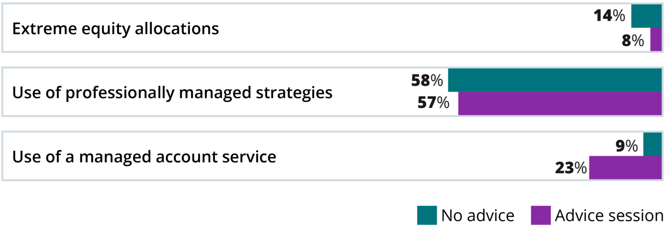The goal is to match an individual’s investment strategy and risk tolerance with their retirement goals. Flagging extreme equity allocations (<0 equity or 100% equity) can help identify savers that could benefit from professionally managed strategies or point-in-time investment recommendations. Individuals who have advice sessions are less likely to have extreme equity allocations.