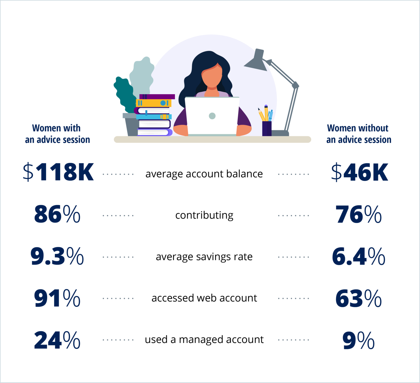 Women are taking advantage of advice sessions in line with their overall plan representation relative to men. Also, women who take part in advice sessions have significantly better retirement metrics than women who don’t. RPAs also shared that women tend to view and approach retirement planning differently than men and underscored the importance of accounting for that fact — echoing Empower’s past research focused on women in government.7